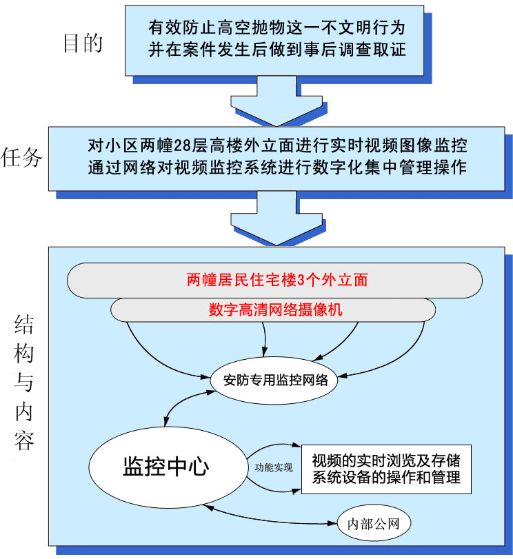 在此情況下,為了進一步的對高空拋物這種危害極大的不文明行為進行制止,我們需要建設(shè)一套全數(shù)字高清化的視頻監(jiān)控系統(tǒng)。通過以文明行為宣傳為主,監(jiān)控管理為輔的方式,有效的對高空拋物這一不文明行為進行制止,同時也能夠在拋物事件發(fā)生后,做到事后取證并追究相關(guān)人員的法律責任。