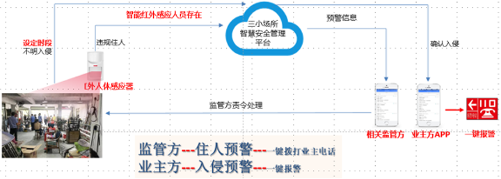 紅外人體存在感應器在設定的時間內(可自由設置)實時感知三小場所夜間人員滯留情況,當探測到人員存在時,立即預警,推送報警信息至相關監(jiān)管方/業(yè)主方APP上。
